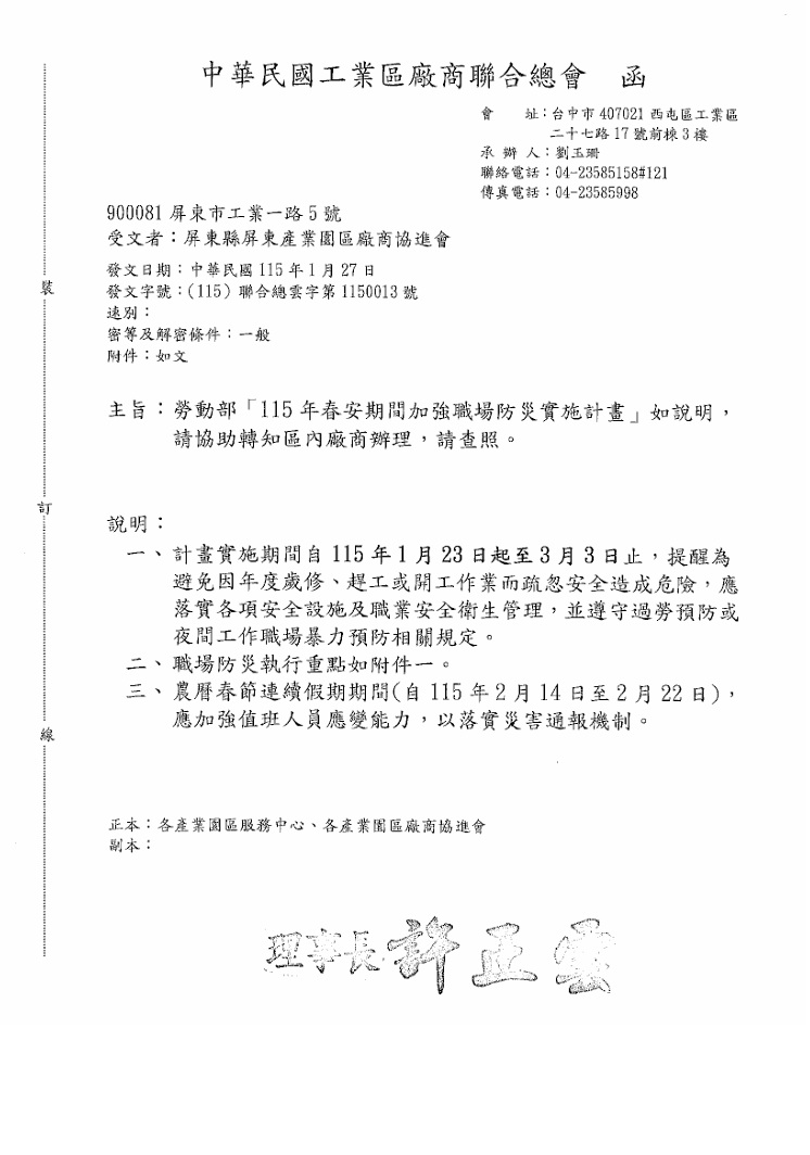 春節期間為產業運作變動較大的時期,為確保園區勞工安全並預防職災發生,本會轉知中華民國工業區廠商聯合總會及勞動部之公文通知 ,請各廠商配合執行「115年春安期間加強職場防災實施計畫」 。