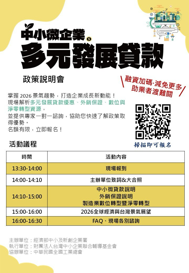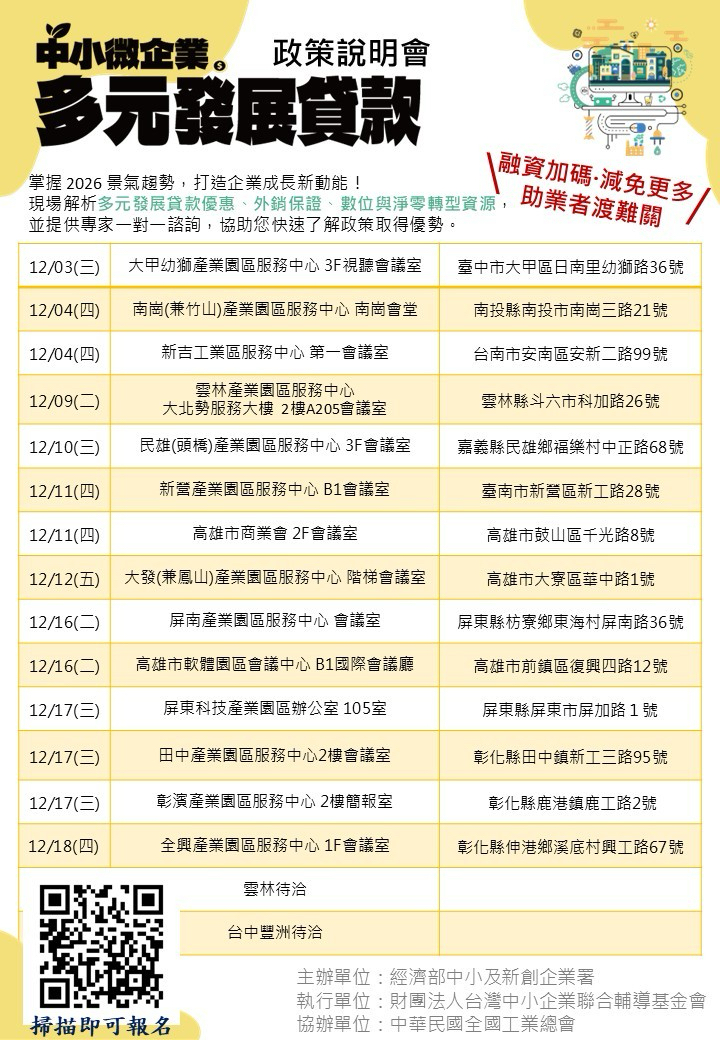大家好,以下轉發經濟部中小及創新企業署辦理「中小微企業多元發展貸款」政策說明會資訊,請轉知公司,謝謝。